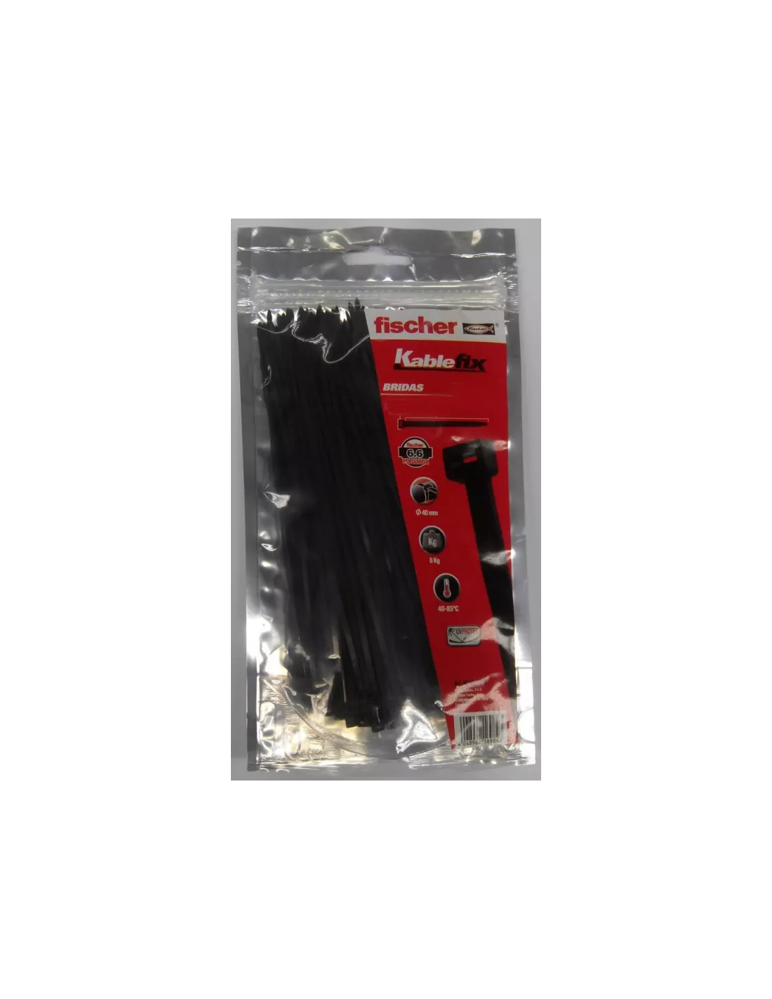 Brida Nylon UBN 3.6x150 Negro de FISCHER, en bolsa de 100. Fabricada en poliamida 6.6, ideal para organizar cables y elementos con durabilidad y resistencia.
