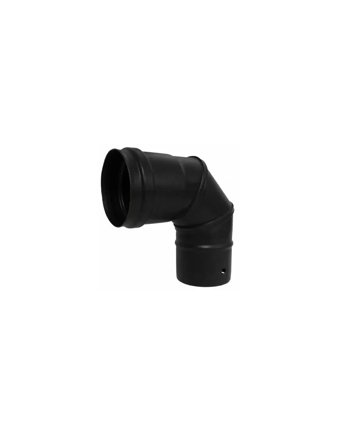 Codo de 90 de 80 mm en acero vitrificado negro, resistente a altas temperaturas. Ideal para estufas y calderas. Certificado CE.