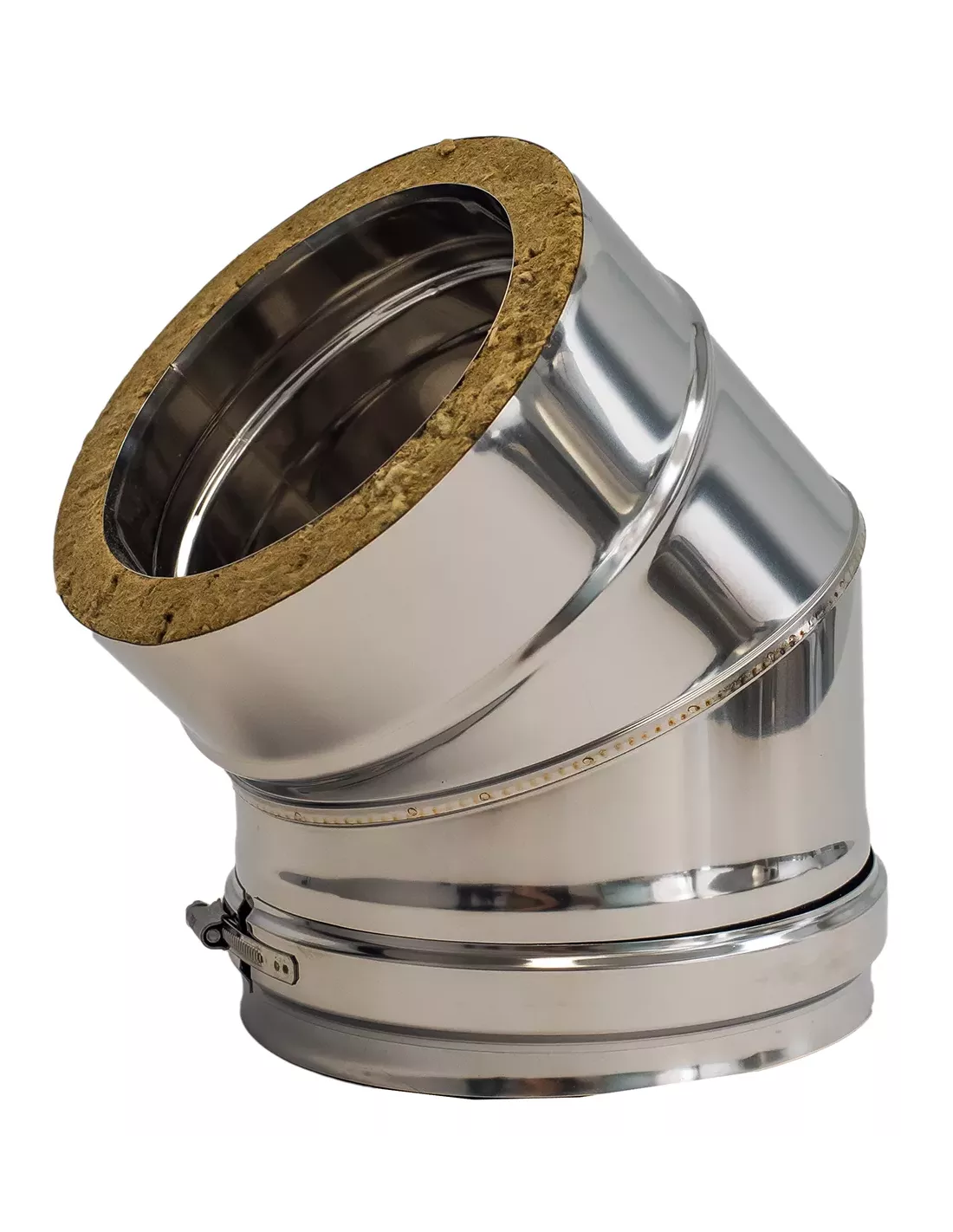 Codo pellet doble pared INOX plata 45 con interior de acero inoxidable 316 y exterior de acero inoxidable 304, ideal para sistemas de calefacción.
