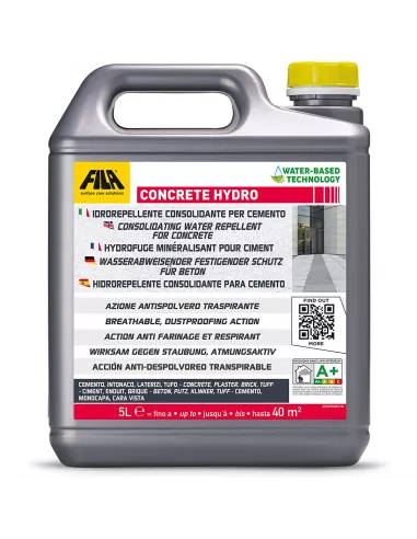 Concrete Hydro es un potente impermeabilizante y consolidante diseñado para proteger y realzar pavimentos, revestimientos y elementos decorativos de origen cementoso. Ideal para hormigón, monocapa, morteros a la cal, piedra artificial y ladrillos cara vista, este producto de la marca Fila es la solución perfecta para mantener tus superficies en óptimas condiciones. Con Concrete Hydro, podrás:no solo proteger tus superficies del deterioro causado por los agentes atmosféricos, sino también reforzarlas evitando el caleo. Su fórmula innovadora garantiza una alta resistencia al agua, manteniendo al mismo tiempo la transpirabilidad de la superficie, lo que evita la absorción de humedad. Además, este producto previene la acumulación de eflorescencias como carbonatos, sulfatos y salitre, limitando el crecimiento de algas, moho y líquidos, y contrarrestando el ennegrecimiento provocado por el smog y la contaminación. Concrete Hydro es la opción ideal tanto para suelos y revestimientos de interior como de exterior, asegurando que tus materiales de cemento, hormigón, yeso, piedra reconstituida, ladrillo y toba se mantengan compactos, resistentes y duraderos. No esperes más, dale a tus espacios el cuidado que merecen con Concrete Hydro y disfruta de la calidad y protección que solo Fila puede ofrecer.