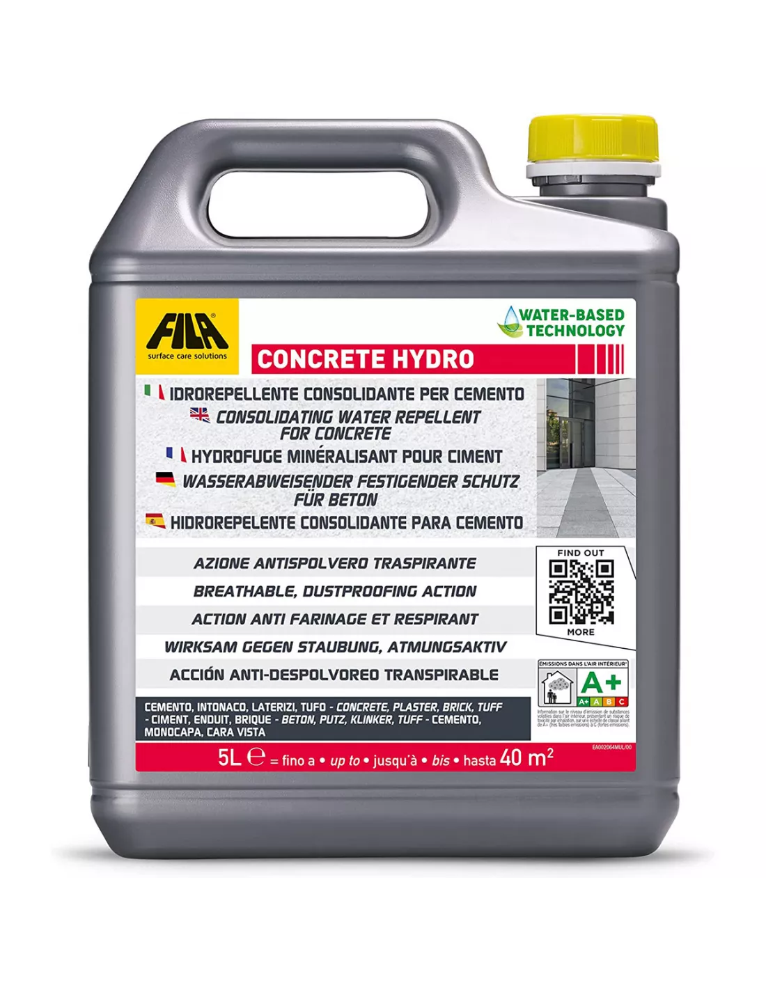 Concrete Hydro es un potente impermeabilizante y consolidante de Fila, diseñado para proteger y realzar pavimentos y revestimientos de cemento, hormigón y ladrillos. Ideal para interiores y exteriores, previene el deterioro y la acumulación de eflorescencias, asegurando durabilidad y resistencia.