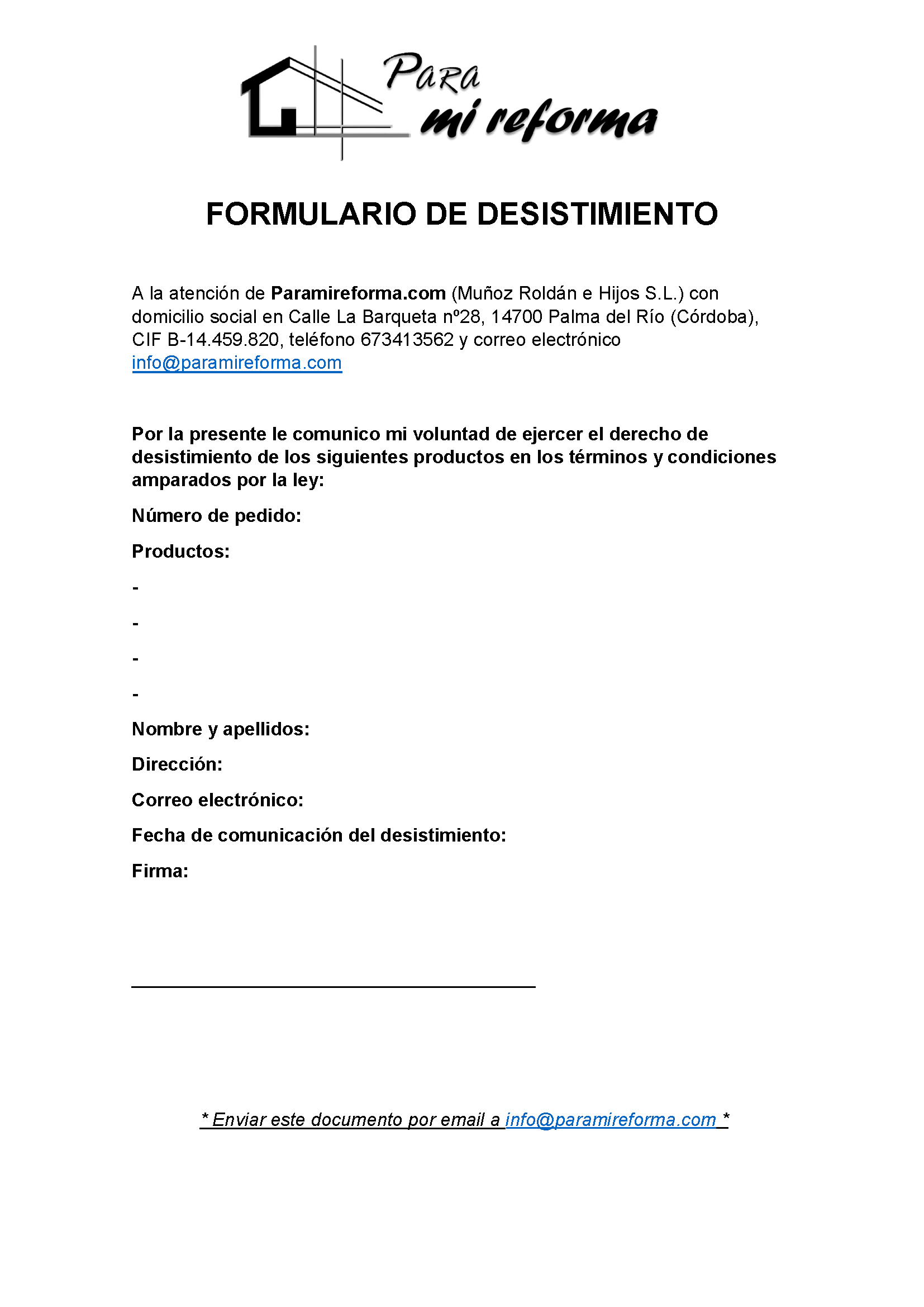 Si desea ejercer su derecho de desistimiento en algún pedido o artículo debe remitirnos, en los plazos establecidos en nuestros Términos y Condiciones y en los plazos que marca la Ley, el siguiente formulario mediante correo electrónico a info@paramireforma.com