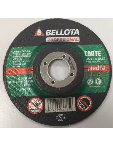 El Disco Abrasivo 50302-115X3 de BELLOTA, con diámetro de 115mm y espesor de 3mm, es ideal para corte de piedra, mármol y granito. Su diseño permite cortes precisos en materiales frágiles y es apto para uso en seco, perfecto para tus proyectos de desbaste y saneado.