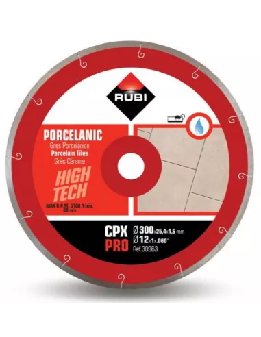 El Disco Diamante Continuo Porcelánico CPX 300 Humedo de RUBI es ideal para cortes rectos en gres porcelánico. Destaca por su alta velocidad de corte y diseño J-SLOT, proporcionando rendimiento eficiente y calidad en trabajos exigentes.
