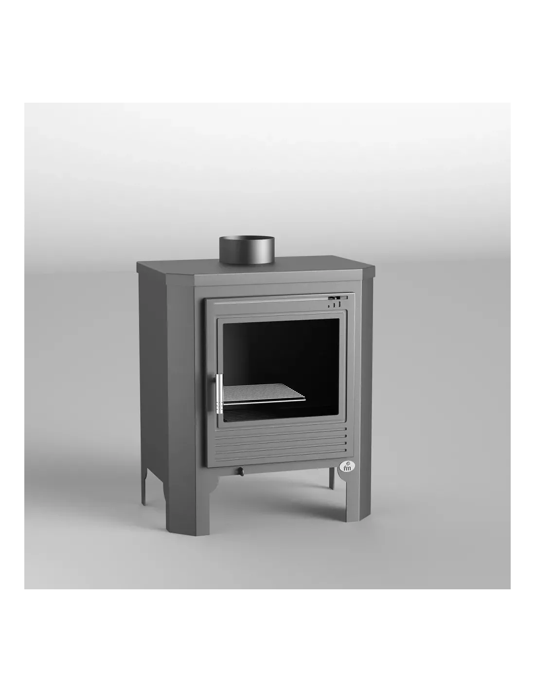 Estufa con interior de vermiculita, cenicero extraíble, puerta y parrilla de fundición. salida de humos de 150 mm macho en fundición.