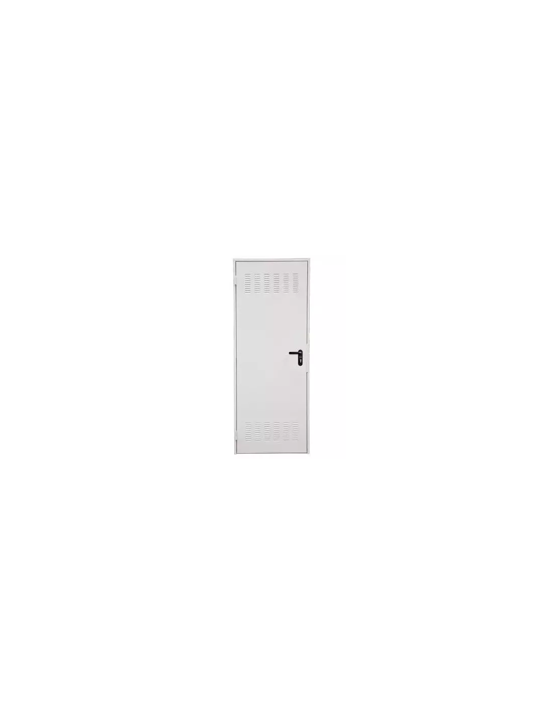 Puerta batiente a izquierdas de 90 cm, chapa galvanizada, cerradura reversible y manillas negras incluidas. Resistente a la corrosión y adecuada para ambientes húmedos.