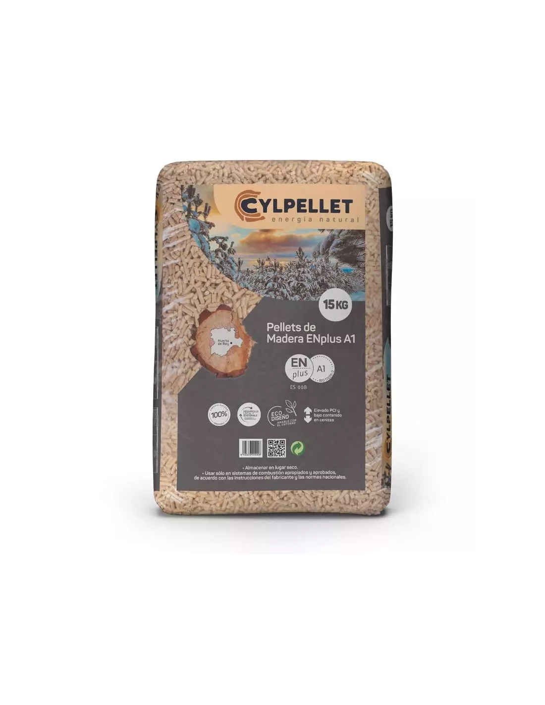 Saco de pellet de 15 kg de calidad máxima, certificado PEFC y ENplus, ideal para una combustión eficiente y sostenible.