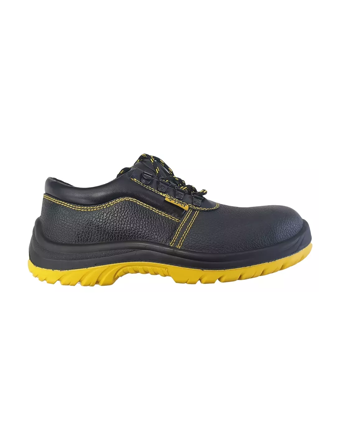 Zapato de seguridad S3 en piel negra y amarilla, con puntera metálica, suela antideslizante y acolchado en collarín. Ideal para trabajos que requieren protección.